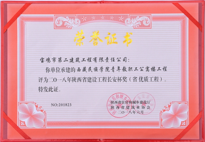 長(zhǎng)安杯獎(jiǎng)是陜西省住房和城鄉(xiāng)建設(shè)廳評(píng)選、頒發(fā)的本省建設(shè)工程質(zhì)量最高榮譽(yù)獎(jiǎng)。西藏民族學(xué)院青年職工公寓樓工程是西藏民族學(xué)院(現(xiàn)更名西藏民族大學(xué))確定的重點(diǎn)建設(shè)工程項(xiàng)目,也是公司推行內(nèi)部模擬股份制架構(gòu)下精細(xì)化管理模式試點(diǎn)項(xiàng)目。在建設(shè)初期,公司總部精心策劃,全力部署,公司領(lǐng)導(dǎo)多次蒞臨施工現(xiàn)場(chǎng)檢查指導(dǎo)工作。公司副總經(jīng)理兼項(xiàng)目經(jīng)理曾永祥精心組織,細(xì)化分工,責(zé)任到人,嚴(yán)格要求項(xiàng)目部全體管理人員,并堅(jiān)持以身作則,帶領(lǐng)整個(gè)團(tuán)隊(duì),戰(zhàn)高溫、抗嚴(yán)寒、抓質(zhì)量、搶進(jìn)度,最終完成了這項(xiàng)經(jīng)得起各方檢驗(yàn)的優(yōu)質(zhì)工程,為業(yè)主和社會(huì)交上了一份滿(mǎn)意的答卷。