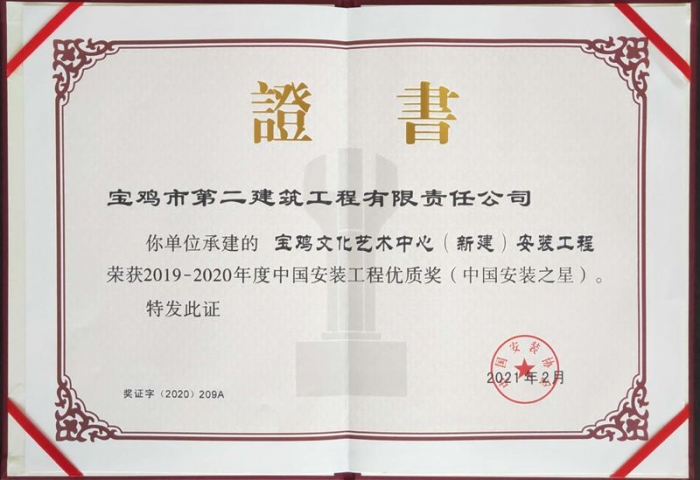 4月22日,中國(guó)安裝協(xié)會(huì)第七屆二次理事(擴(kuò)大)會(huì)議暨工程創(chuàng)優(yōu)經(jīng)驗(yàn)交流會(huì)在濟(jì)南召開。會(huì)議對(duì)2019-2020年度中國(guó)安裝工程優(yōu)質(zhì)獎(jiǎng)(中國(guó)安裝之星)獲獎(jiǎng)企業(yè)及個(gè)人進(jìn)行了表彰,由寶雞二建承建的寶雞文化藝術(shù)中心項(xiàng)目安裝工程獲此殊榮。
